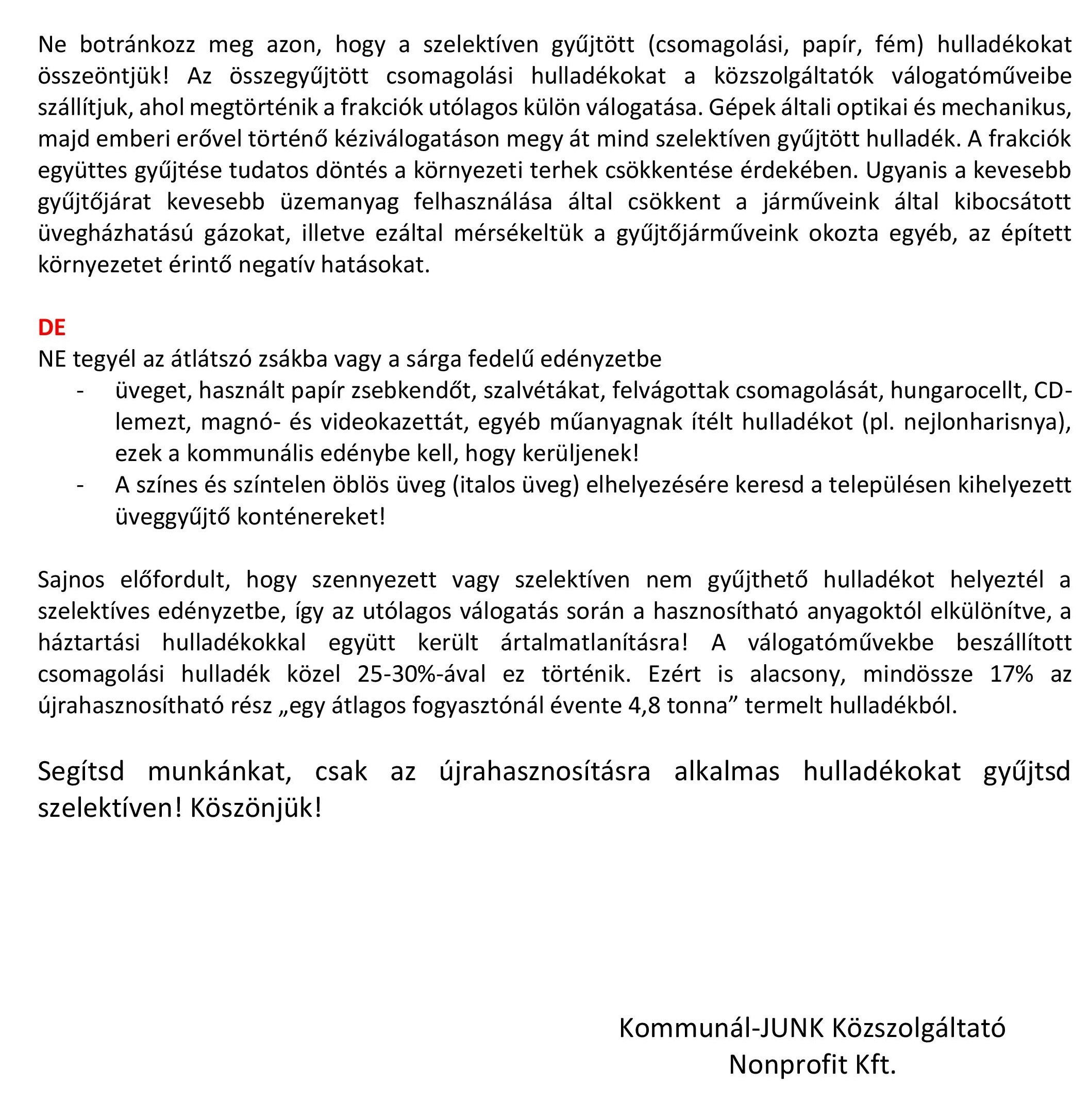 Kérjük, olvassák el figyelmesen a hulladékszállítással megbízott szolgáltatónk konzorciumi partnerének tájékoztatóját!
