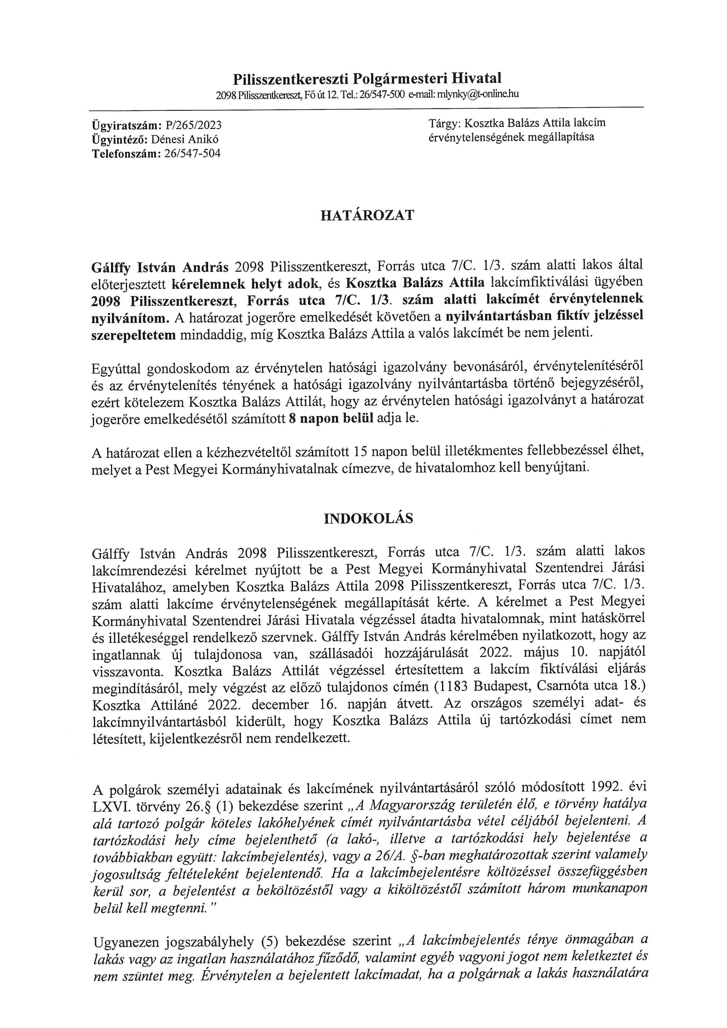 Az ülés helye: Pilisszentkereszt, Fő út 14.