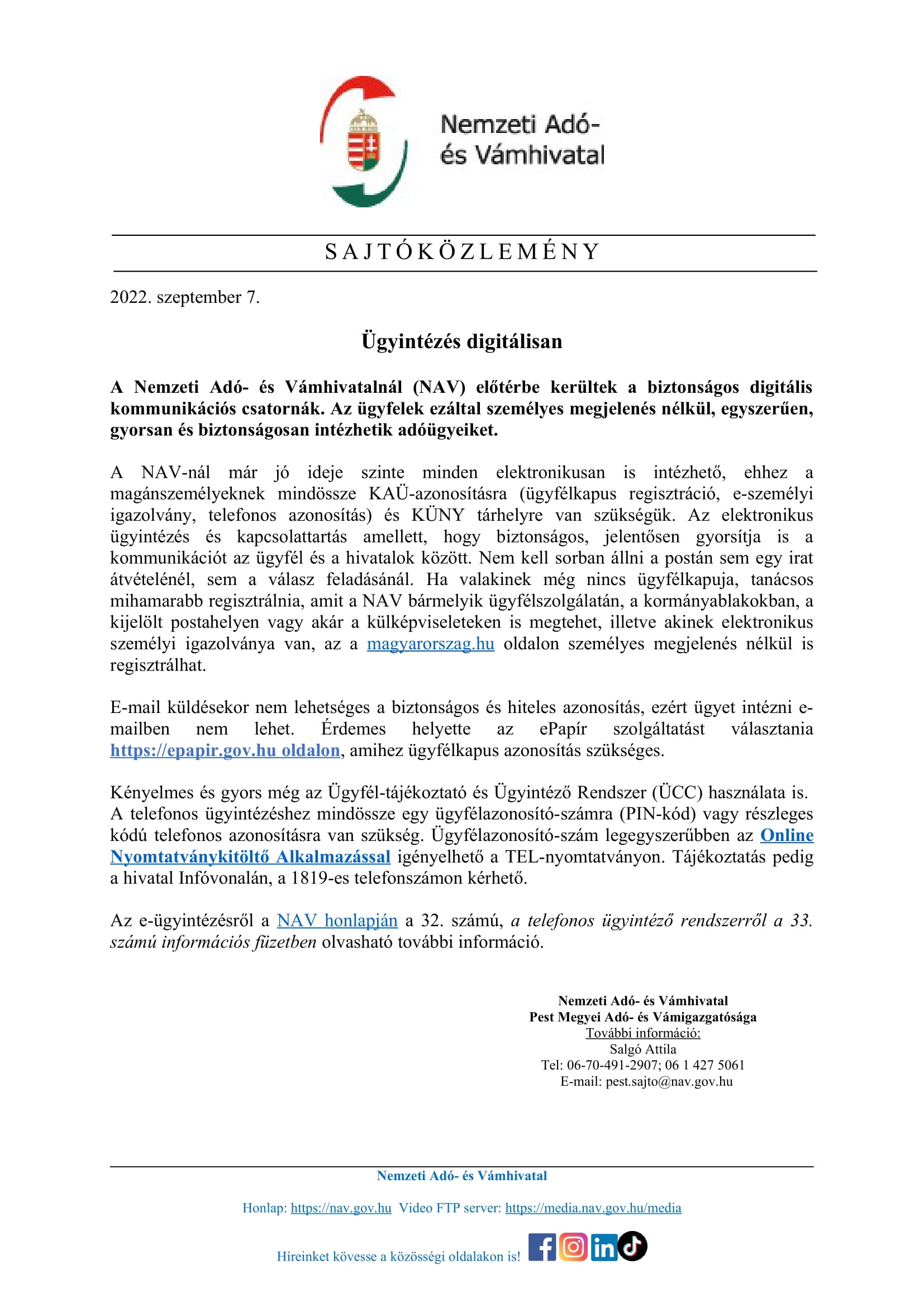 NAV sajtóközlemény - Ügyintézés digitálisan