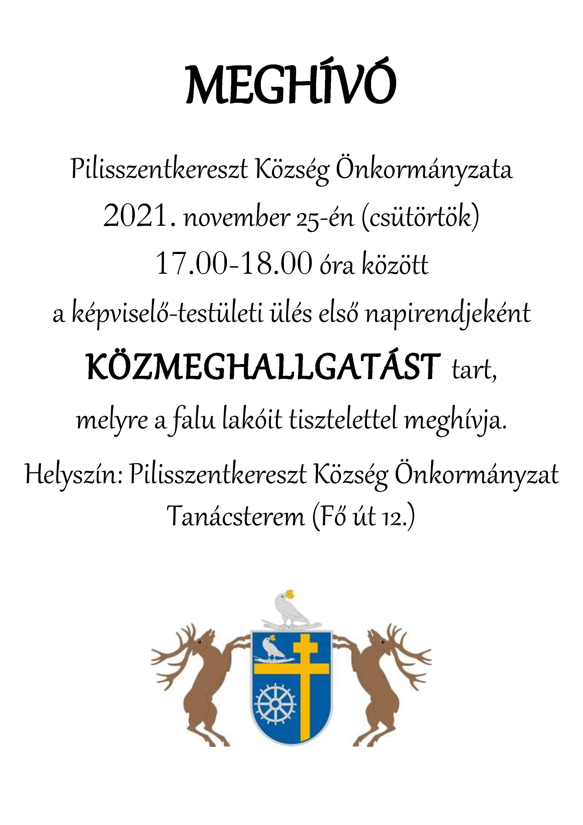 2021. november 25-én (csütörtök) 17.00 órakor közmeghallgatással egybekötött testületi ülést tart, melyre tisztelettel meghívom.