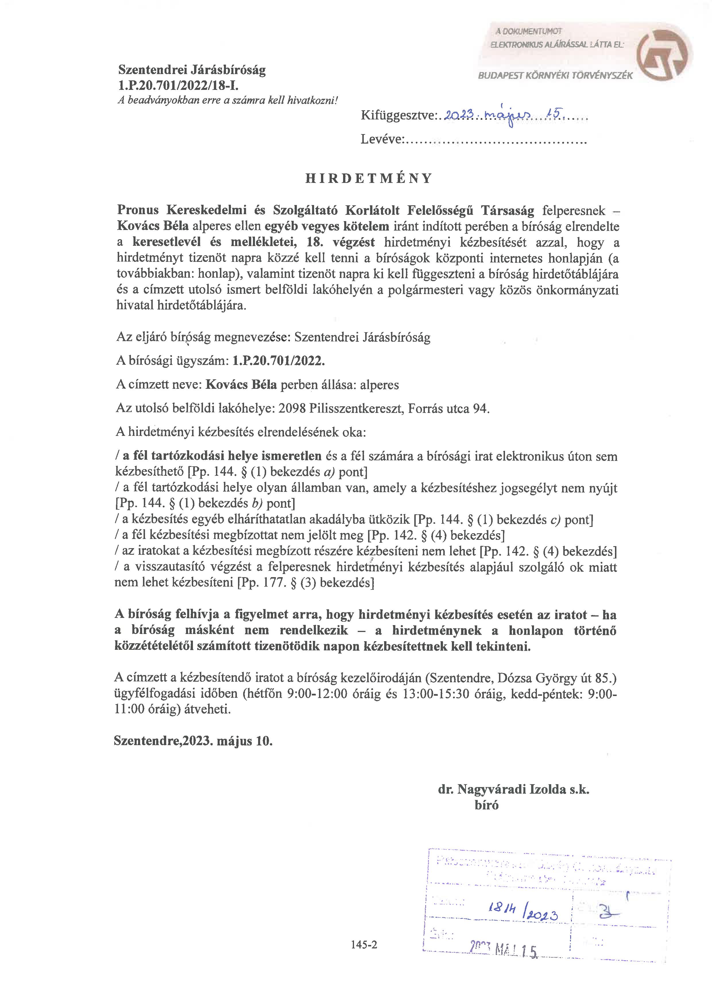 Kovács Béla - hirdetmény