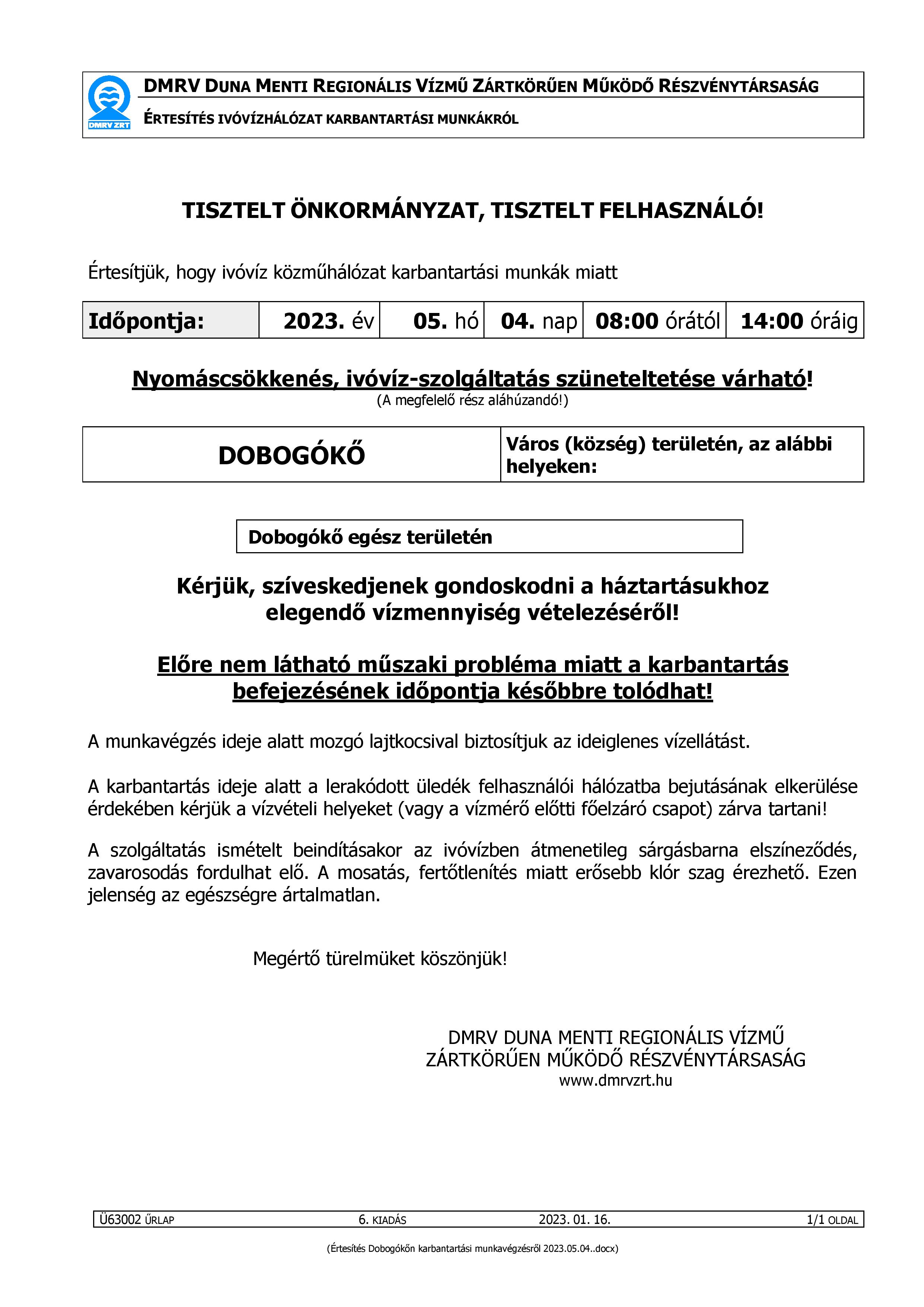 Ivóvíz szolgáltatás szünetelése Dobogókőn