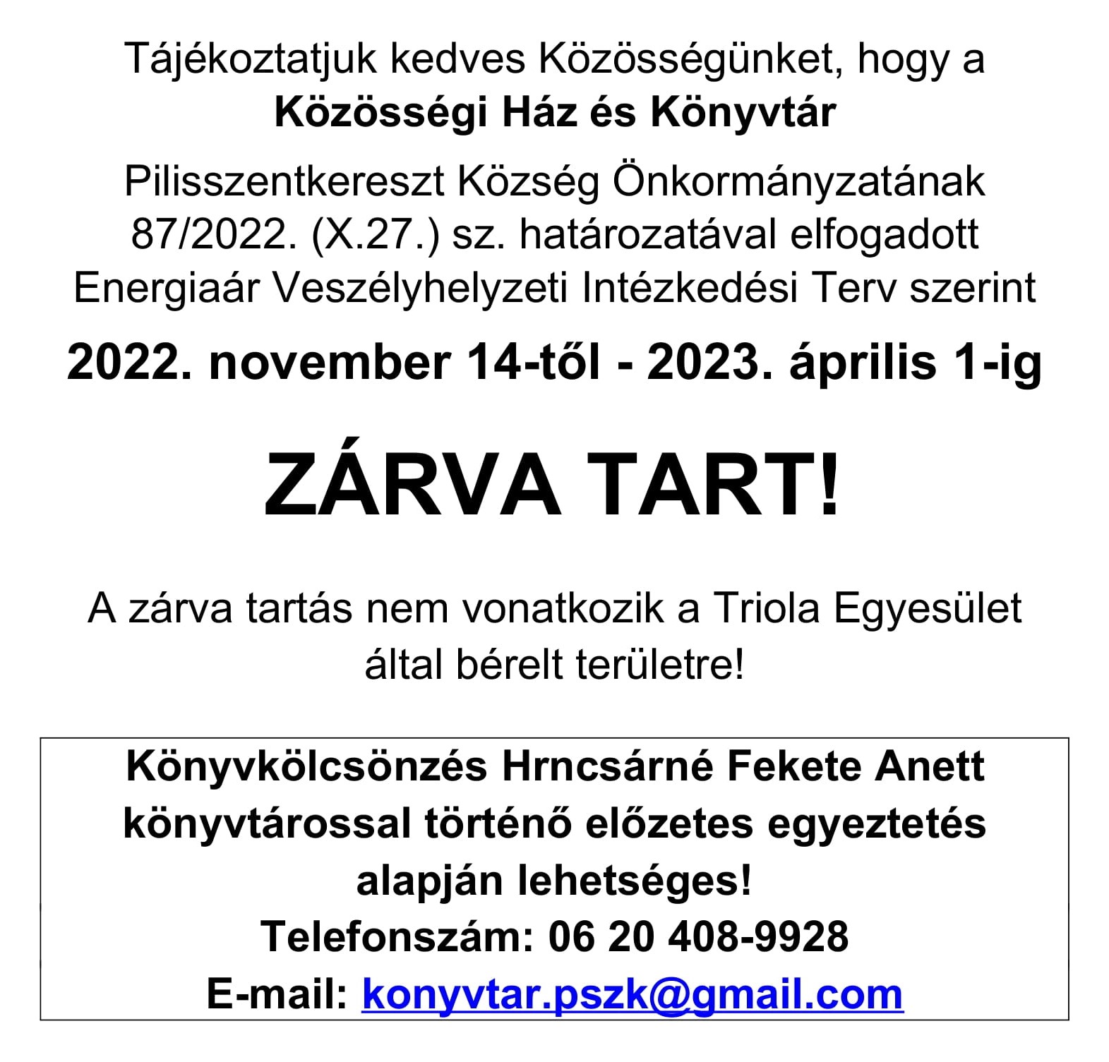 Közösségi Ház és Könyvtár téli zárvatartása